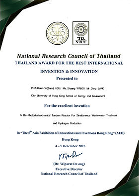We are thrilled to announce that our invention, the Bio-Photoelectrochemical Tandem Reactor (BPTR), has been awarded The Best International Invention & Innovation Award from the National Research Council of Thailand (NRCT) and Silver Medal at the 2025 Asia Exhibition of Innovations and Inventions (AEII) Hong Kong, held on December 4-5, 2025.